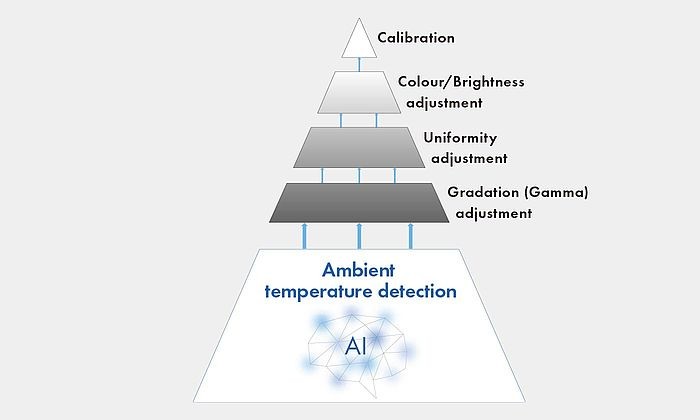 Per garantire che la resa cromatica, il livello di luminosità e altre caratteristiche rimangano sempre precise e stabili anche quando la temperatura dell’ambiente cambia, il monitor ColorEdge CG2700X è dotato di un sensore che rileva con precisione la temperatura all’interno del monitor. Un sofisticato algoritmo di correzione assistito da intelligenza artificiale (AI Artificial intelligence)* riconosce le variazioni della temperatura e adegua conformemente la temperatura colore in tempo reale.