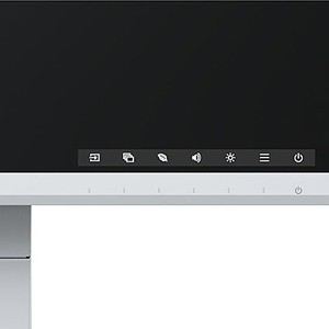 Anche i tasti di comando e logo del monitor EV2760-BK sono incorporati nella superficie ultrapiatta in modo funzionale e pregiato. I suoni vengono riprodotti da due speaker integrati nella parte frontale del cabinet che proiettano un audio nitido direttamente verso l'utente. Tutti gli elementi di controllo, il sensore di luminosità e gli speaker sono integrati in modo invisibile con una notevole riduzione degli ingombri.