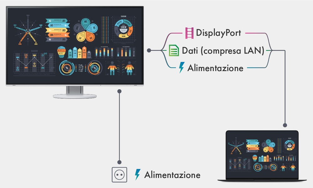 La porta USB-C è estremamente versatile e offre molti vantaggi: dal collegamento a monitor esterni, alla ricarica della batteria e al trasferimento veloce di dati e video. Attraverso un unico cavo il modello EV2795-WT si lascia connettere al proprio laptop e consente anche di pilotare periferiche. Il monitor funge da dock universale con meno ingombro di cavi. Particolarmente utile e comodo per il lavoro agile tra la postazione di lavoro in ufficio e quella a casa. E la tecnologia USB-C consente anche di alimentare e ricaricare velocemente laptop, tablet e telefoni fino a 70 W.