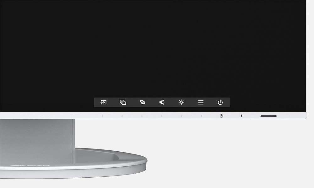 Anche i tasti di comando e logo del monitor EV2795-WT sono incorporati nella superficie ultrapiatta in modo funzionale e pregiato. I suoni vengono riprodotti da due speaker integrati nella parte frontale del cabinet che proiettano un audio nitido direttamente verso l'utente. Tutti gli elementi di controllo, il sensore di luminosità e gli speaker sono integrati in modo invisibile con una notevole riduzione degli ingombri.