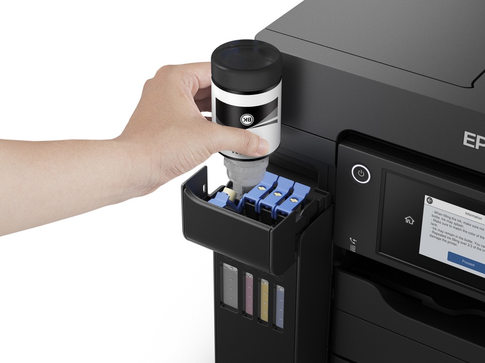 Riempire i serbatoi di inchiostro è semplicissimo grazie ai flaconi di inchiostro richiudibili e con tappo salvagoccia. L’esclusiva tecnologia a freddo Epson PrecisionCore offre maggiore affidabilità, tempi di fermo ridotti e minore impatto ambientale. La stampante non deve riscaldarsi quando è accesa, quindi la prima pagina può essere stampata rapidamente e consumando meno energia. I costi di gestione vengono ulteriormente ridotti grazie alla minore necessità di parti di ricambio (senza danni dovuti al calore, le testine di stampa durano per tutta la vita della stampante).