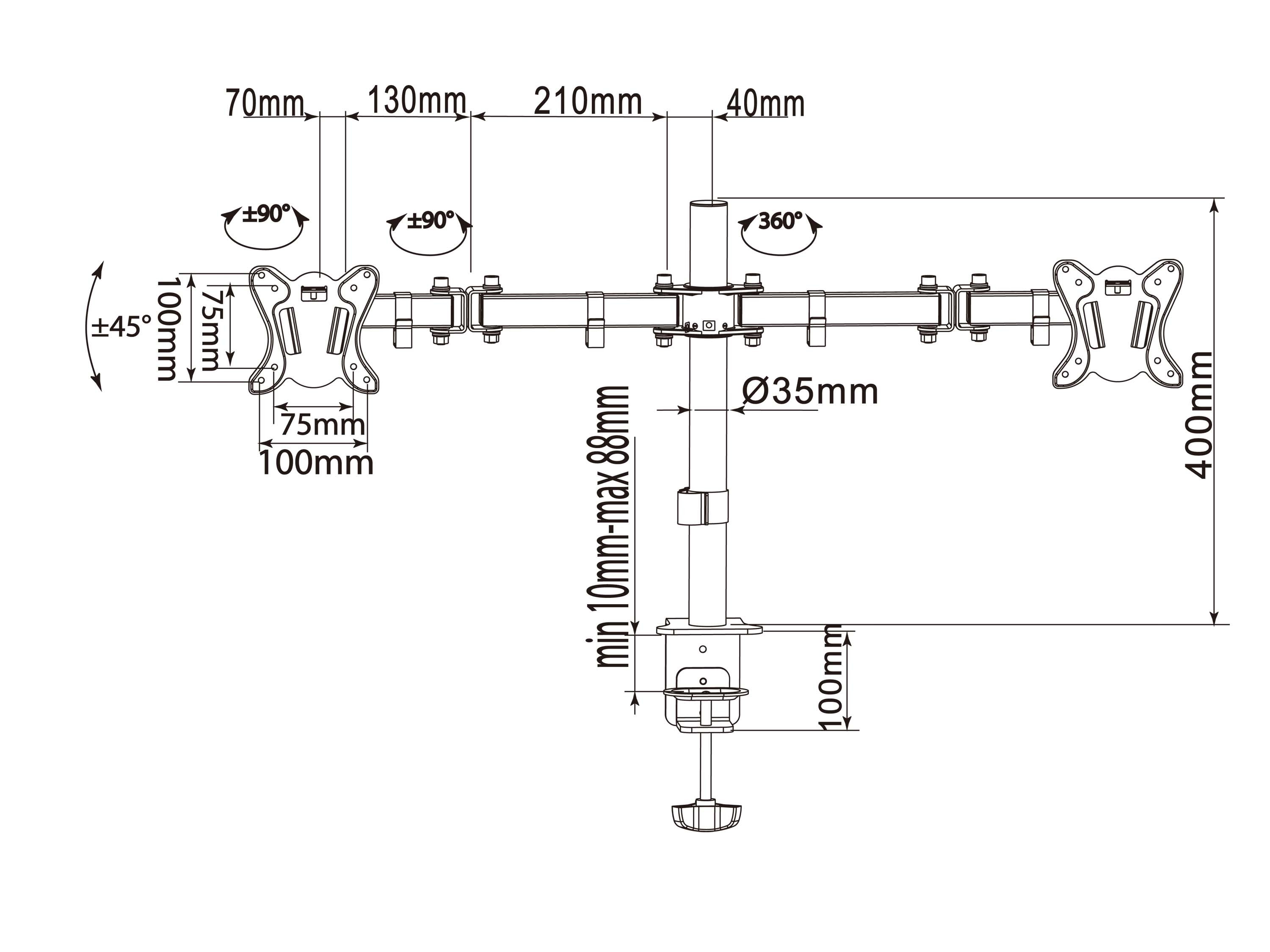 Equip 650152. Montaggio: Morsa, Peso massimo (capacità): 16 kg, Capienza minima dimensioni dello schermo: 33 cm (13"), Capienza massima dimensioni dello schermo: 68,6 cm (27"), Compatibilità interfaccia di montaggio (min): 75 x 75 mm, Compatibilità interfaccia di montaggio (max): 100 x 100 mm. Angolo di rotazione: -90 - 90°, Inclinazione: -45 - 45°. Colore del prodotto: Nero