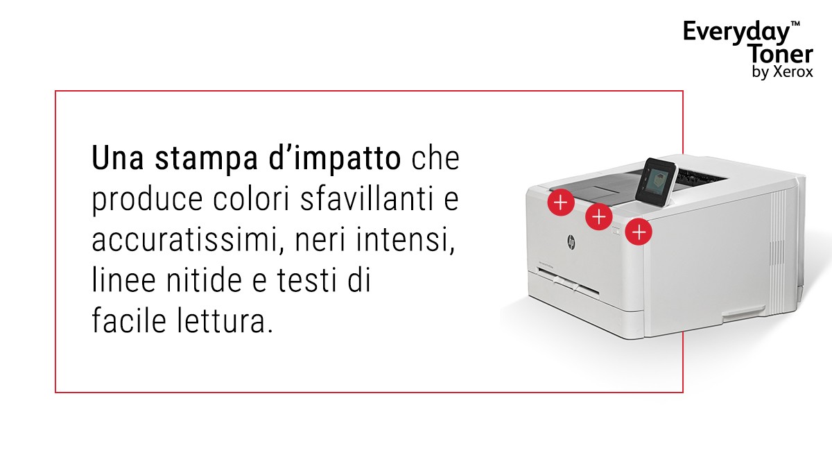 Un impegno di responsabilità ambientale rappresenta l’approccio migliore dal punto di vista commerciale, per il suo impatto positivo sul pianeta, sull’azienda e sulle persone. Il Toner rigenerato Everyday di Xerox produce un’impronta di carbonio minore rispetto a qualsiasi altra cartuccia di toner a singolo utilizzo. Perché non si dovrebbe essere obbligati a scegliere tra fare la propria parte per ridurre l’impatto sull’ambiente e il costo del toner. E la compatibilità con le marche di stampanti più diffuse ti permette di usufruire dell’impareggiabile qualità e impegno ambientale di Xerox indipendentemente dalla stampante che utilizzi.