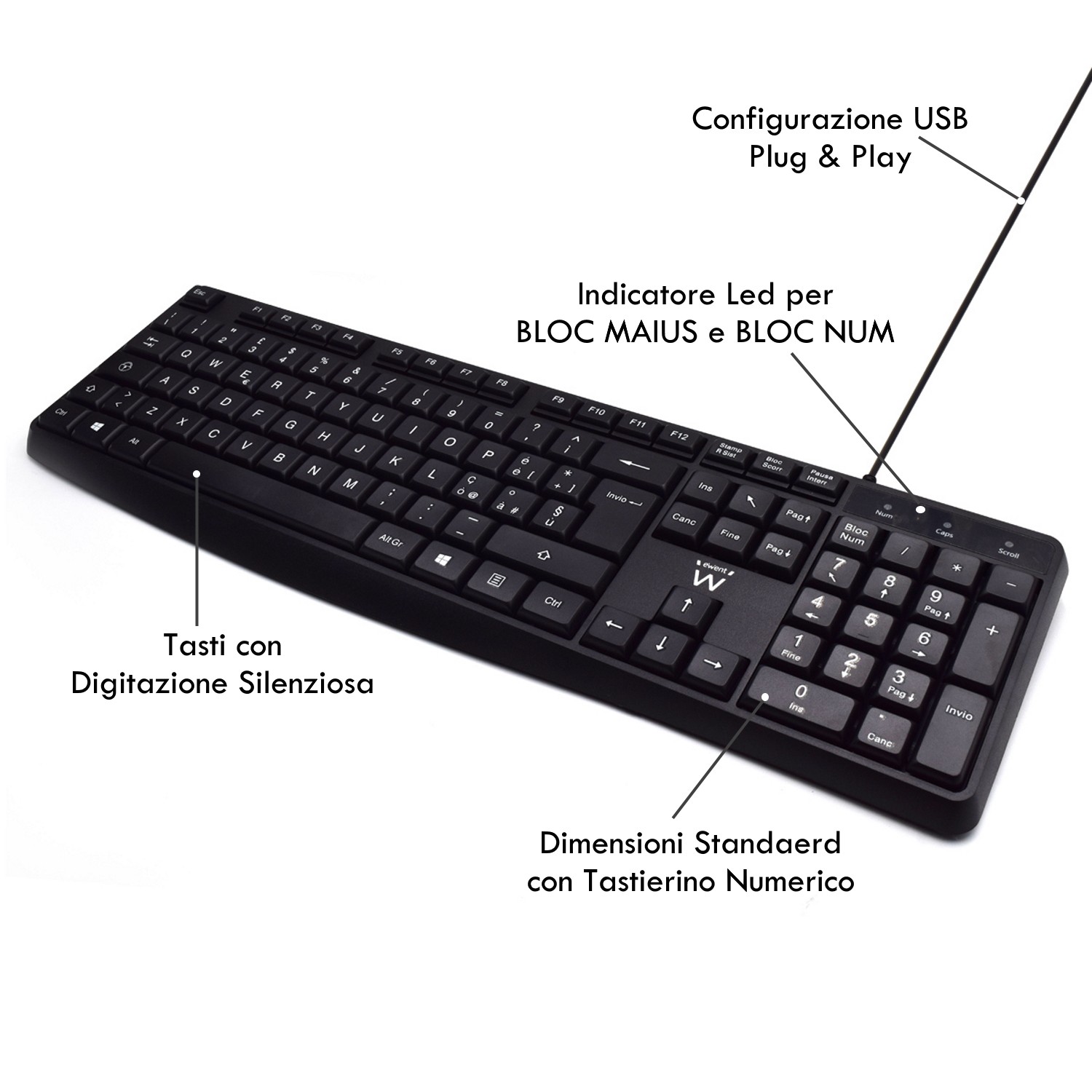 Ewent EW3000. Fattore di forma tastiera: Full-size (100%). Stile tastiera: Dritto. Tecnologia di connessione: Cablato, Interfaccia dispositivo: USB, Interruttore a chiave per tastiera: Interruttore a chiave a membrana, Struttura tastiera: QWERTY, Numero pulsanti tastiera: 104. Lunghezza cavo: 1,35 m. Utilizzo raccomandato: Ufficio. Colore del prodotto: Nero