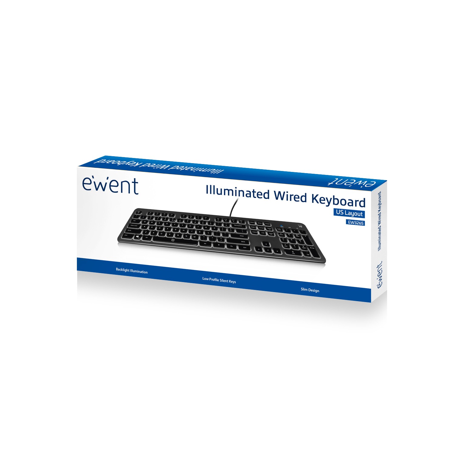 Ewent EW3268. Fattore di forma tastiera: Full-size (100%). Stile tastiera: Dritto. Tecnologia di connessione: Cablato, Interfaccia dispositivo: USB, Interruttore a chiave per tastiera: Tasto con meccanismo a forbici, Struttura tastiera: QWERTY, Numero pulsanti tastiera: 104. Tipologia di retroilluminazione: LED. Lunghezza cavo: 1,5 m. Utilizzo raccomandato: Universale. Colore del prodotto: Nero