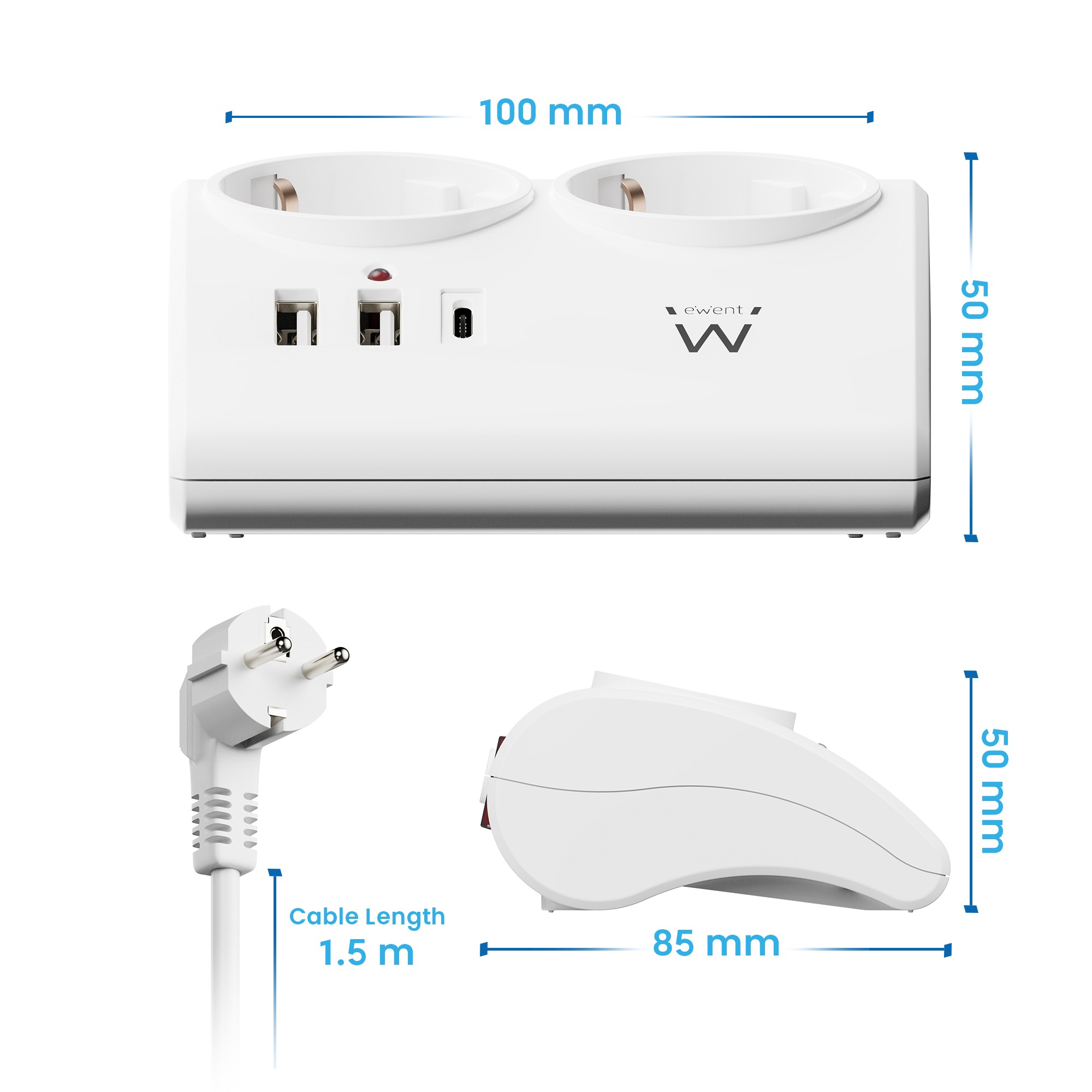 L’EW3870 presenta un design salvaspazio e occupa solo uno spazio limitato sulla scrivania. Tutte le prese di corrente e le porte USB sono facilmente accessibili. È dotato di un cavo lungo 1,5m. Inoltre la spina Schuko 16A salvaspazio è dotata di angolatura a 90° che la rende ideale per essere inserita in prese di corrente a muro presenti in spazi ristretti e angusti !