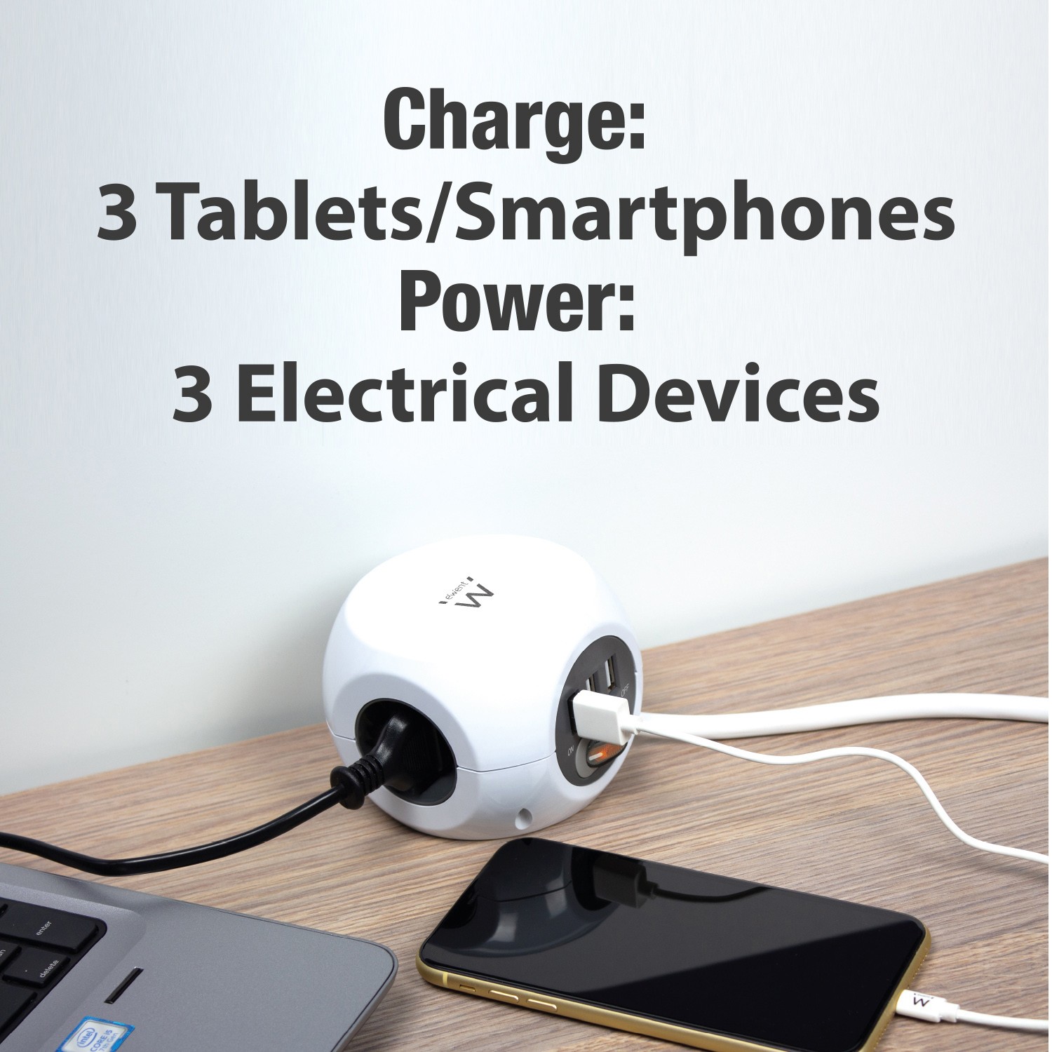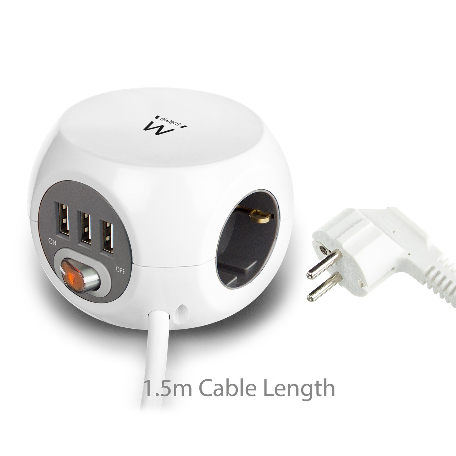 La presa di alimentazione a cubo EW3939 dispone di 3 prese elettriche per collegare 3 dispositivi. Le tre porte USB sono adatte a caricare smartphone e tablet con un carico massimo di 2,4 A alla volta.