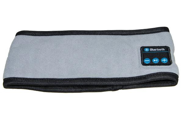 Fascia scaldaorecchie in tessuto con auricolari e microfono, collegamento senza fili a un dispositivo mobile.