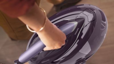 Blocca il ferro in modo sicuro alla base per trasportarlo in modo semplice in casa e per ridurre il rischio di contatto accidentale con la piastra calda.
