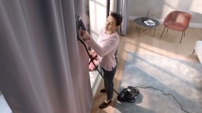 Il ferro è incredibilmente leggero e comodo da usare, scorre in modo semplice e riduce lo stress sui polsi. Grazie al peso minimo di soli 800 g, è inoltre ideale per la stiratura verticale di tende e capi appesi in modo semplice.
