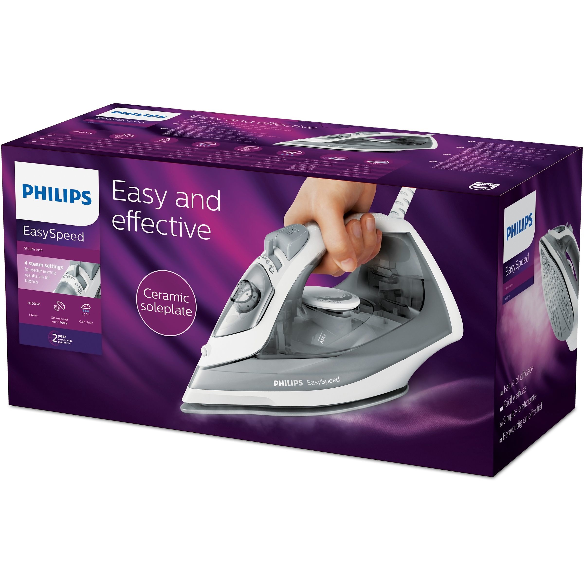 Il ferro EasySpeed rende la stiratura facile ed efficace grazie a un potente getto di vapore che consente di rimuovere le pieghe ostinate. Inoltre, dispone di una piastra in ceramica resistente ai graffi per una perfetta scorrevolezza su tutti i tessuti e della funzione Calc clean per prestazioni durature.