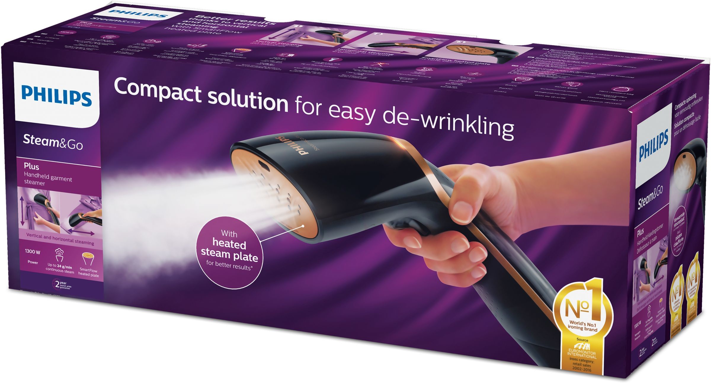 Philips Steam&Go Stiratrice verticale, 1300 W, vapore fino a 24 g/min. Tipo di dispositivo: Spazzola a vapore, Capacità tanica acqua: 0,07 L, Tempo di riscaldamento: 1 min. Potenza: 1300 W, Tensione di ingresso AC: 220 - 240 V. Larghezza imballo: 380 mm, Profondità imballo: 150 mm, Altezza imballo: 128 mm