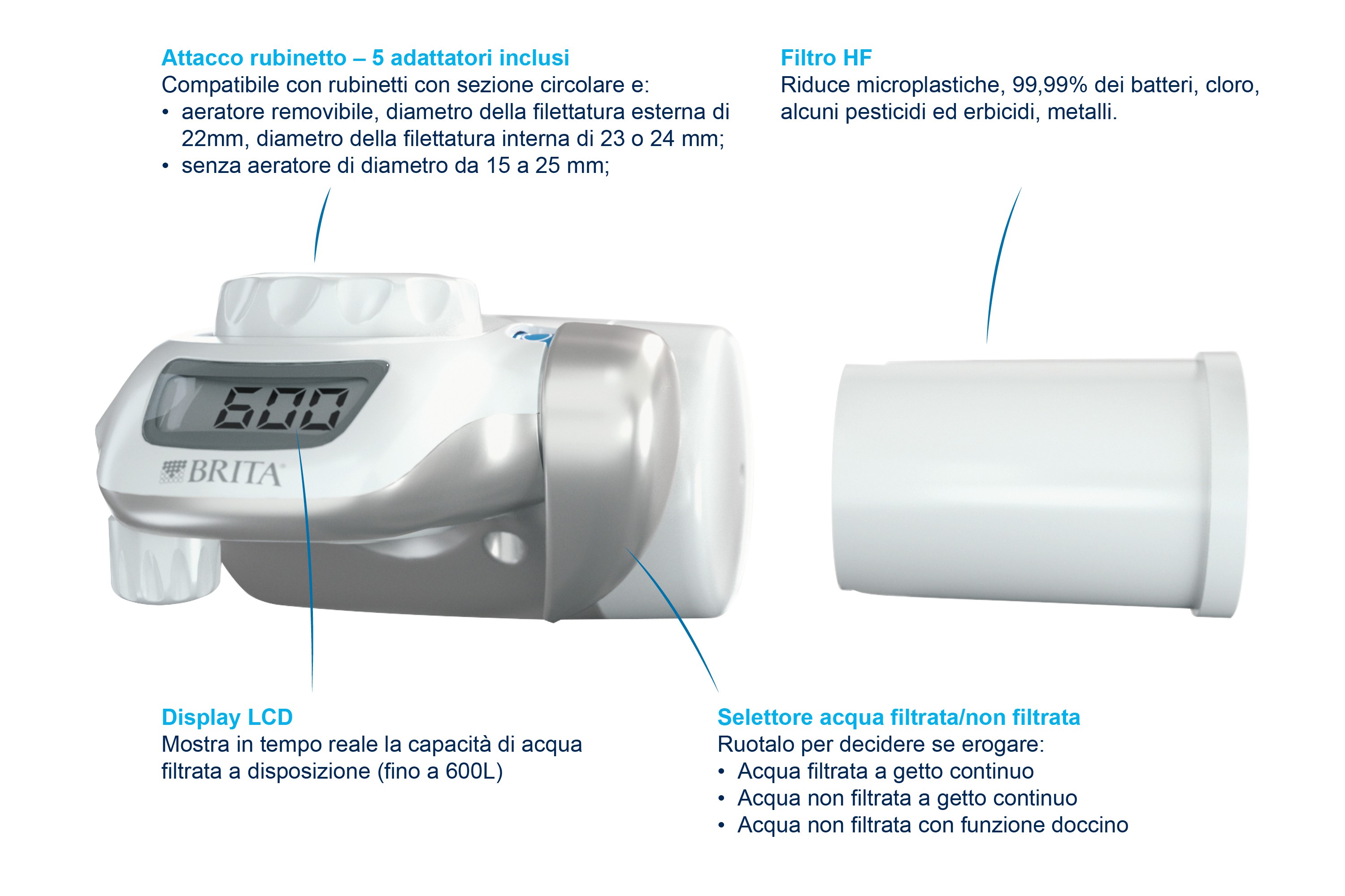 Sistema filtrante BRITA: il filtro HF riduce cloro, batteri, microplastiche, pesticidi ed erbicidi per acqua filtrata buona da bere. Riduci la plastica monouso e cambia il mondo, un sorso alla volta. Con il sistema filtrante BRITA On Tap e il filtro HF hai acqua filtrata buona da bere e ideale per cucinare. Il filtro HF ti assicura fino a 600L di acqua filtrata e riduce cloro, 99,99% dei batteri, microparticelle come le microplastiche, pesticidi, erbicidi. Nella confezione sono inclusi 5 adattatori per installare il sistema sul tuo rubinetto. Cambia il mondo, un sorso alla volta, con BRITA. Chi è BRITA? BRITA è specialista a livello mondiale nella filtrazione d’acqua da oltre 50 anni e ti offre le sue soluzioni perché tu possa avere la migliore esperienza filtrante possibile: a casa, con caraffe o sistemi collegati a rubinetto, fuori casa con le borracce filtranti; al bar, al ristorante, nelle scuole, negli ospedali e negli uffici con filtri professionali ed erogatori d’acqua. Guidata dalla propria Vision di cambiare le abitudini delle persone nel bere acqua in modo sostenibile, BRITA si impegna ogni giorno per creare un impatto positivo sull’ambiente.