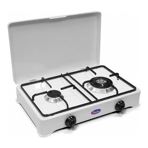 Fornello a gas a 2 fuochi, smaltato bianco, con coperchio, bruciatori in lega Pyral N2, spartifiamma smaltati, griglia in acciaio smaltato. Bruciatore doppia corona da 3,5 kw.