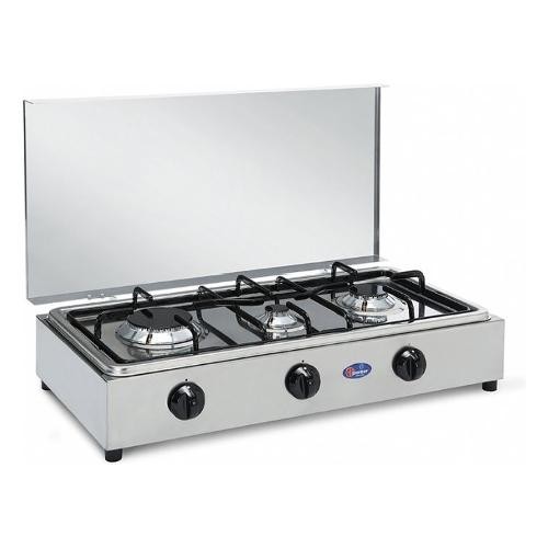 Fornello 3 fuochi, bruciatori in lega Pyral N2, spartifiamma smaltati, griglia smaltata.