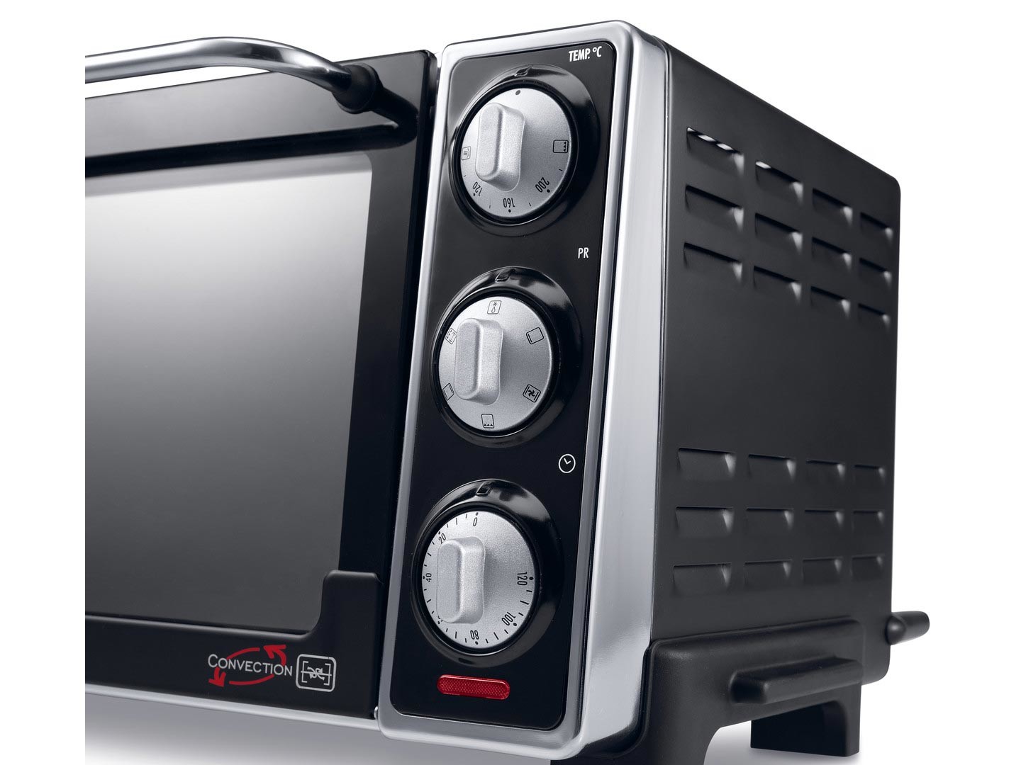 FAN-OVEN FUNCTION The fan-oven function permits to cook two different dishes at the same time, without mixing their flavours. Besides, cooking times are reduced. ROASTING SPIT Roasting spit function for perfectly roasted chickens LARGE CAPACITY Despite its small size, it is generous enough to cook pizzas up to 31cm indiameter - 6 cooking functions:convection oven, traditional oven, grill, lower heating element, rotisserie, defrost. - Non stick interior - Keep warm setting: to maintain food ready for serving - 120-minute timer with auto shut-off and ready bell to programme cooking time - Adjustable thermostat from 80-240 °C - Accessories: wire rack, baking pan, rotisserie spit with handle - Maximum power: 1300 Watt