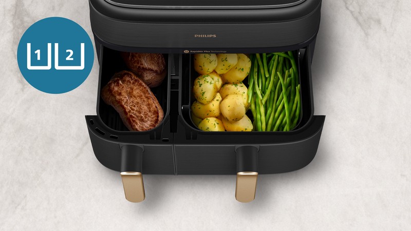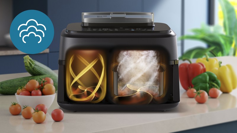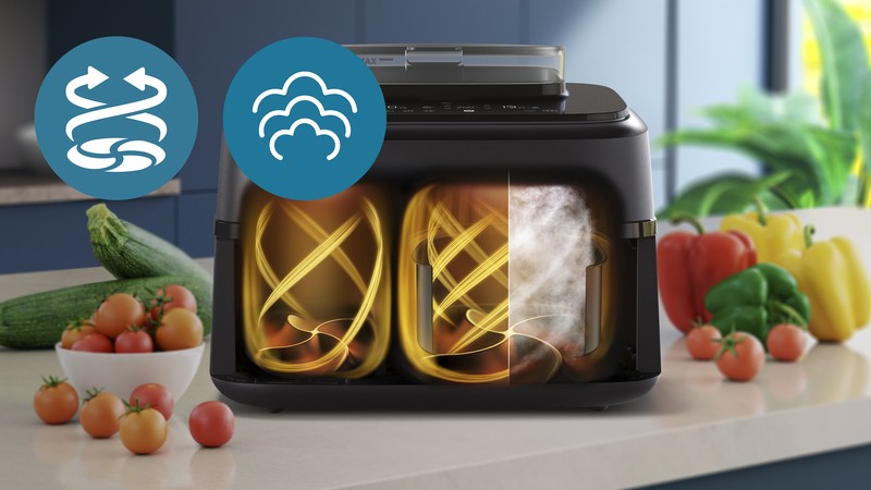 Due cestelli per friggere, cuocere al forno, arrostire e grigliare e uno per la cottura a vapore. Goditi pasti perfettamente cotti grazie alla tecnologia RapidAir Plus e Air Steam