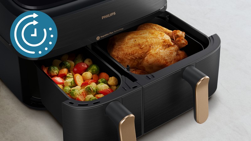Cuoci fino al 40% più velocemente e risparmia fino all' 80% di energia usando Airfryer con doppio cestello di Philips anziché usare il forno ⁶