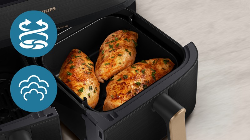 Il 90% dei consumatori è soddisfatto del gusto. La tecnologia RapidAir Plus con la tecnologia Air Steam consente di ottenere la tenerezza della cottura a vapore e la croccantezza della frittura ad aria ⁵