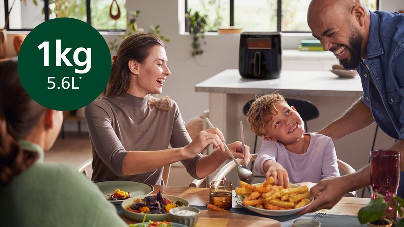 Airfryer Serie 3000 è stato progettato pensando alla tua famiglia. La capacità di 5,6l ti permette di cucinare un'ampia varietà di pasti per un massimo di 4 porzioni alla volta.