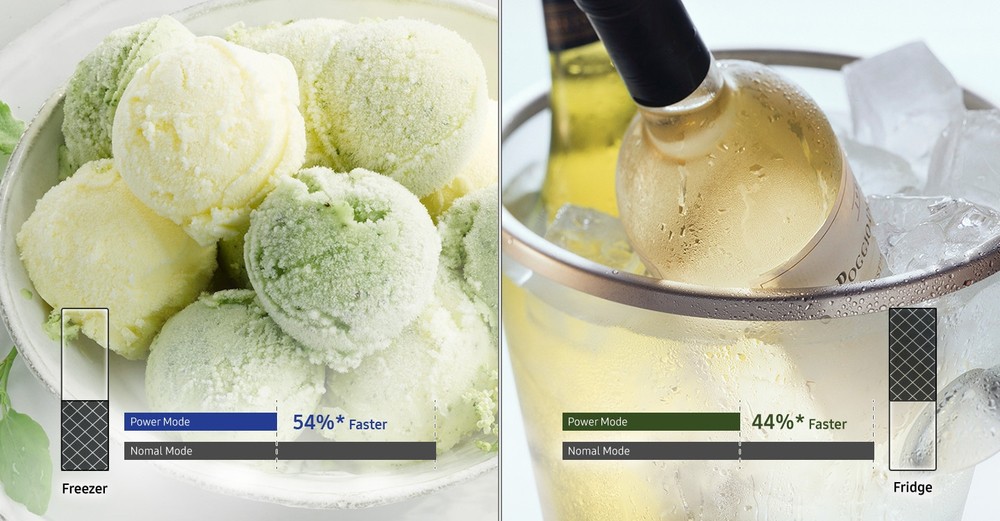 Anche la velocità è importante. Premendo un pulsante, la funzione Power Cool fa circolare velocemente aria fredda nel frigorifero per raffreddare rapidamente cibi e bevande. La funzione Power Freeze crea un rapido getto di aria fredda nel freezer. È il massimo per congelare o raffreddare i cibi al punto giusto, ma anche per preparare il ghiaccio.