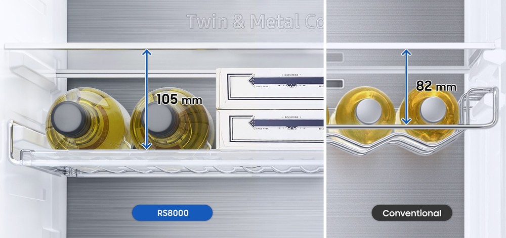 Maggiore capienza e prestazioni efficienti. Diversamente dai condotti convenzionali, la sottile ventola di raffreddamento presente nella parete posteriore è completamente piatta, in modo da ridurre al minimo lo spazio morto e offrire più agio per la conservazione degli alimenti. Raffreddamento e ventilazione mantengono prestazioni ottimali, per alimenti sempre freschi e gustosi.