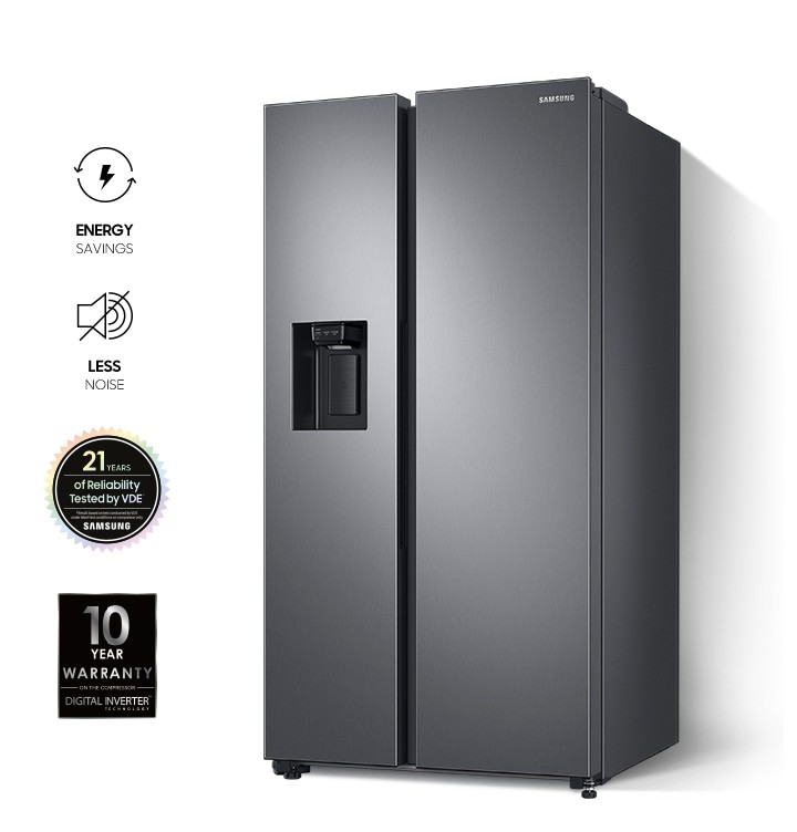 Samsung RS68A8842SL. Posizionamento dell'apparecchio: Libera installazione, Colore del prodotto: Grigio, Tipo di lampada: LED. Capacità netta totale: 609 L, Classe climatica: SN-T, Classe emissione rumore: B. Capacità netta frigorifero: 402 L, Capacità lorda frigorifero: 415 L. Capacità netta congelatore: 207 L, Posizione del congelatore: Posizionato lateralmente, Capacità di congelamento: 12 kg/24h. Classe efficienza energetica: D, Consumo energetico annuo: 257 kWh, Scala di efficienza energetica: Da A a G