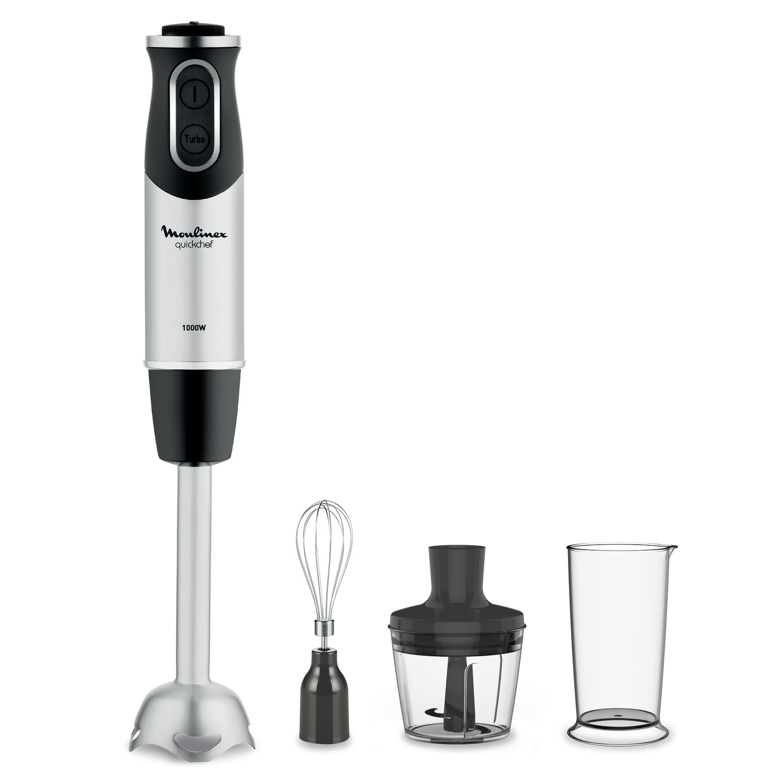 Frullatore a immersione QuickChef: potente emulsione a portata di mano Potenza ottimale senza alcuna fatica! Con il frullatore ad immersione Quickchef di Moulinex, godi di alte prestazioni e controllo totale grazie alla Powelix Technology e alle sue lame combinate con il motore da 1000 W che amplificano la potenza raggiungendo risultati perfetti ogni volta. Questa tecnologia assicura una incredibile cremosità in poco tempo, anche con gli ingredienti più difficili! In più, le 10 velocità possono essere regolate senza arrestare la macchina mediante un quadro di comandi intuitivo e facile da usare. Il mixer beneficia anche di pratiche carattersitiche che include una protezione antischizzi, un'impugnatura antiscivolo per un maggiore comfort d'uso e le componenti lavabili in lavastoviglie per una facile pulizia. A completamento, vengono forniti un bicchiere da 800 ml, un tritatutto da 500 ml per sminuzzare facilmente vari ingredienti e una frusta per sbattere senza fatica.