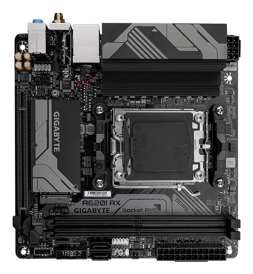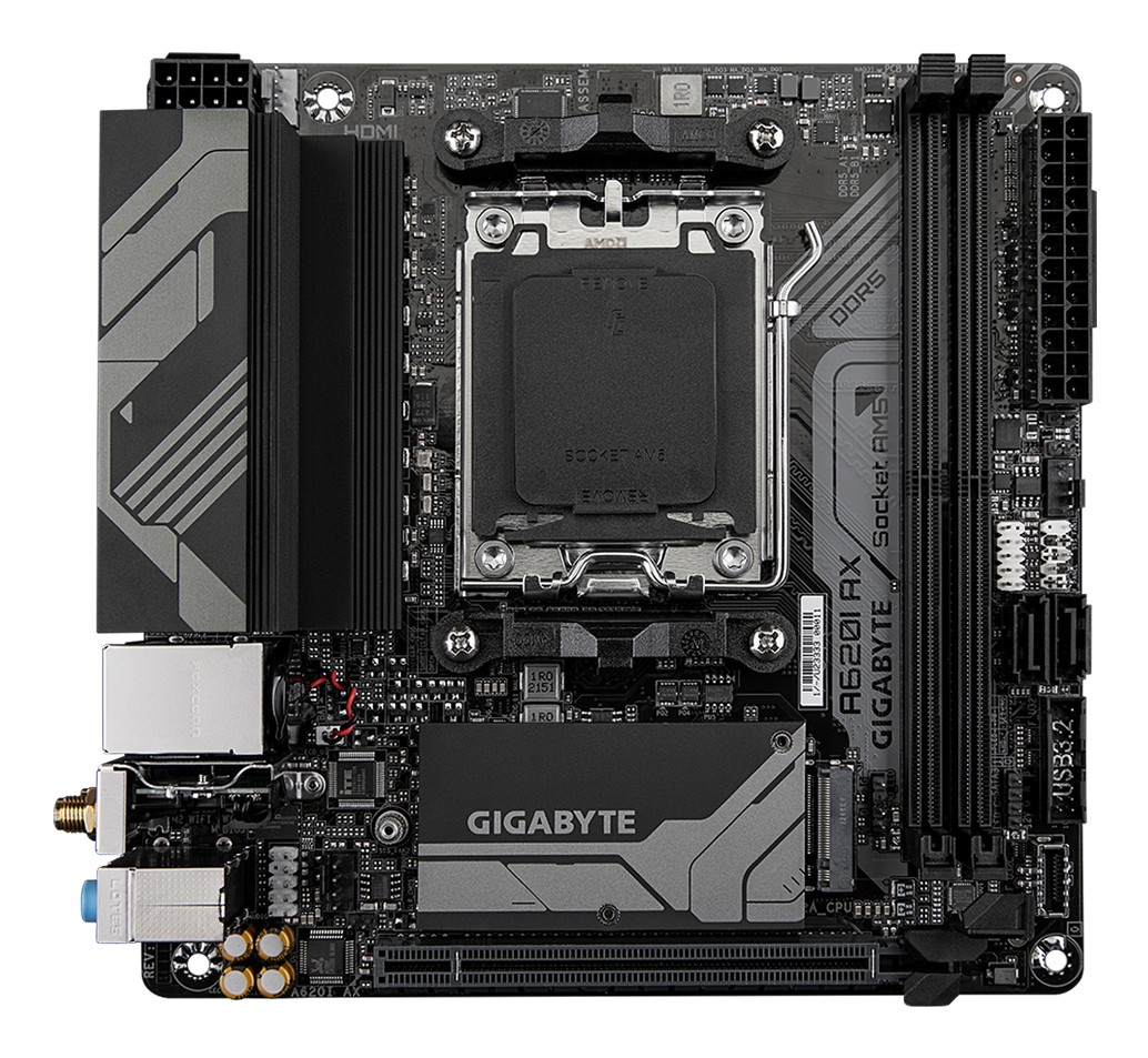 GIGABYTE A620I AX Scheda madre - Supporta CPU AMD Ryzen 8000, VRM digitale a 5+2+1 fasi, fino a 6400MHz DDR5 (OC), 1xPCIe 4.0 M.2, Wi-Fi 6E, LAN 2.5GbE, USB 3.2 Gen 2. Produttore processore: AMD, Presa per processore: Socket AM5, Processori compatibili: AMD Ryzen 7000 Series. Tipi di memoria supportati: DDR5-SDRAM, RAM massima supportata: 96 GB, tipo di slot di memoria: DIMM. Interfacce dell'unità di archiviazione supportate: M.2, SATA III, Tipi di unità di archiviazione supportate: HDD & SSD, Livelli RAID: 0, 1. Risoluzione massima: 4096 x 2160 Pixel. Connettore USB: USB tipo A, USB tipo-C