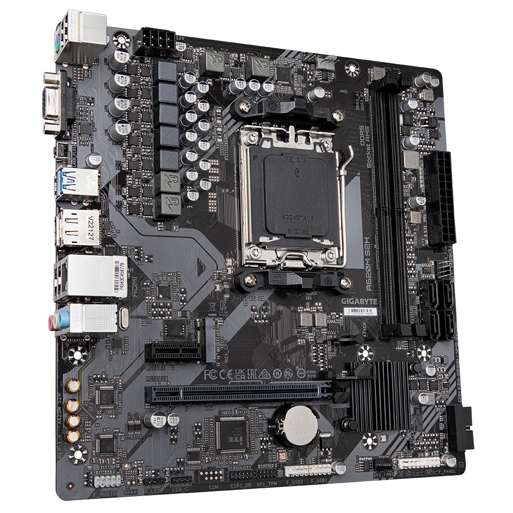 Gigabyte A620M S2H. Produttore processore: AMD, Presa per processore: Presa di corrente AM5, Processori compatibili: AMD Ryzen™ 5, AMD Ryzen 7 7th Gen, AMD Ryzen 9 7th Gen. Tipi di memoria supportati: DDR5-SDRAM, RAM massima supportata: 96 GB, tipo di slot di memoria: DIMM. Interfacce dell'unità di archiviazione supportate: M.2, SATA III, Tipi di unità di archiviazione supportate: HDD & SSD, Livelli RAID: 0, 1, 10. Risoluzione massima: 4096 x 2160 Pixel. Connettore USB: USB tipo A, USB tipo-C