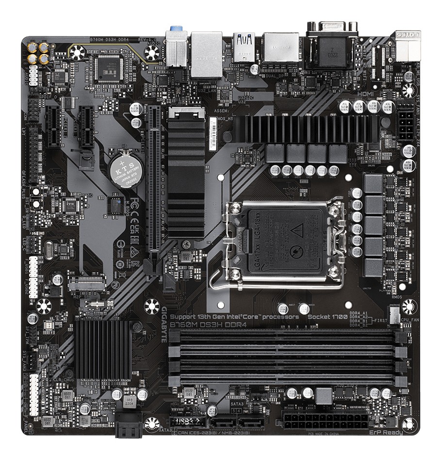 GIGABYTE B760M DS3H DDR4 Scheda Madre - Supporta CPU Intel Core di 14a Generazione, VRM Digitale 6+2+1 Fasi, fino a 5333MHz DDR4 (OC), 2xPCIe 4.0 M.2, LAN 2.5GbE, USB 3.2 Gen2. Produttore processore: Intel, Presa per processore: LGA 1700, Processori compatibili: Intel® Celeron®, Intel® Core™ i3, Intel® Core™ i5, Intel® Core™ i7, Intel® Core™ i9,.... Tipi di memoria supportati: DDR4-SDRAM, RAM massima supportata: 128 GB, tipo di slot di memoria: DIMM. Interfacce dell'unità di archiviazione supportate: M.2, SATA III, Tipi di unità di archiviazione supportate: HDD & SSD, Livelli RAID: 0, 1, 5, 10. Risoluzione massima: 4096 x 2304 Pixel. Tipo di interfaccia Ethernet: 2.5 Gigabit Ethernet