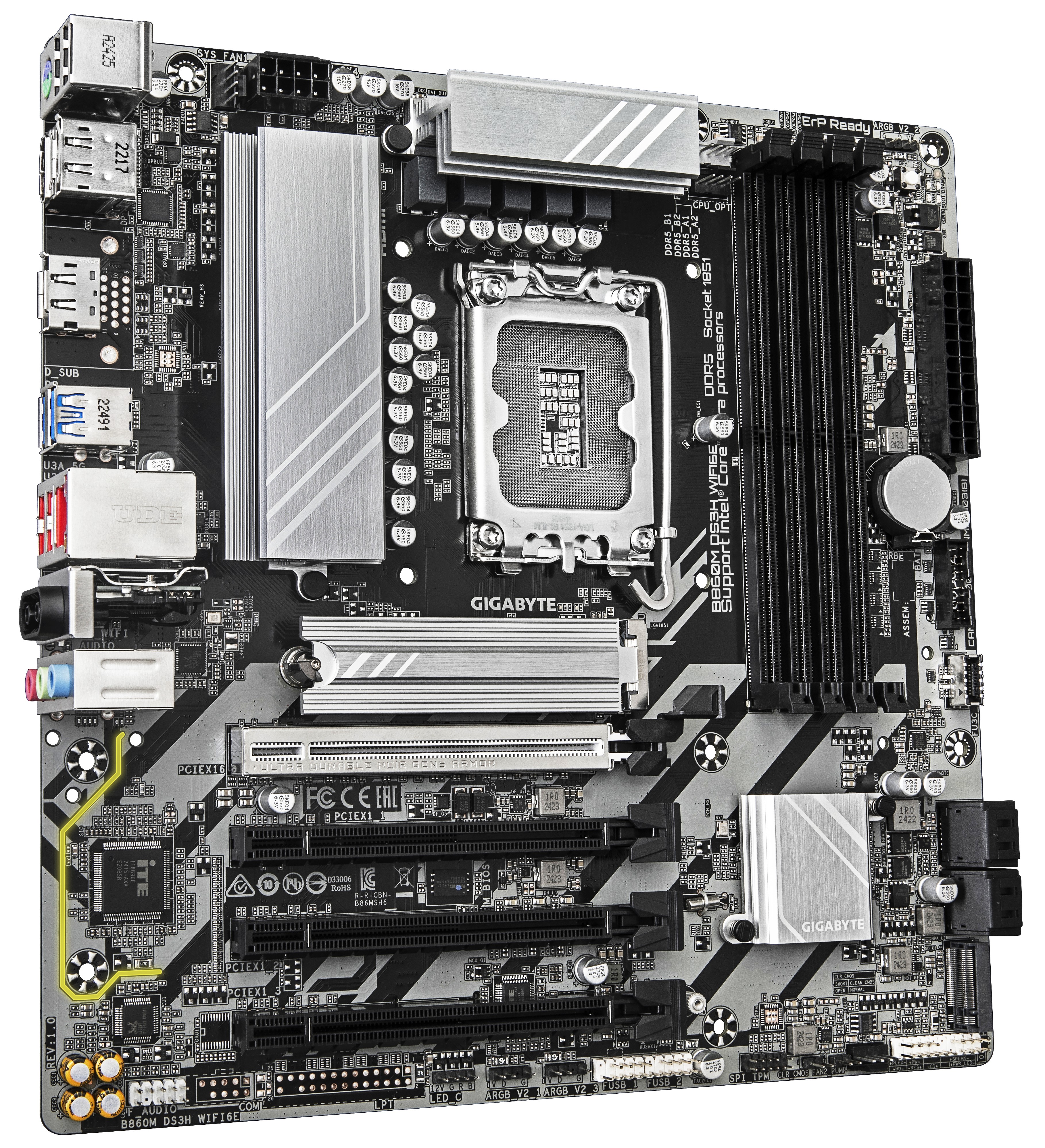 GIGABYTE B860M DS3H WIFI6E Scheda madre - CPU Intel Core Ultra, VRM a 5+1+2+1 fasi, fino a 9066MHz DDR5, 1xPCIe 5.0 + 1xPCIe 4.0 M.2, LAN 2,5 GbE, WIFI 6E, USB 3.2 Gen 2. Produttore processore: Intel, Presa per processore: LGA 1851 (Socket V1), Processori compatibili: Intel Core Ultra (Series 1), Intel Core Ultra (Series 2). Tipi di memoria supportati: DDR5-SDRAM, RAM massima supportata: 256 GB, tipo di slot di memoria: DIMM. Interfacce dell'unità di archiviazione supportate: M.2, SATA III, Tipi di unità di archiviazione supportate: HDD & SSD, Livelli RAID: 0, 1, 5, 10. Risoluzione massima: 4096 x 2160 Pixel. Tipo di interfaccia Ethernet: 2.5 Gigabit Ethernet, Controller LAN: Realtek RTL8125, Wi-Fi standard: Wi-Fi 6E (802.11ax)