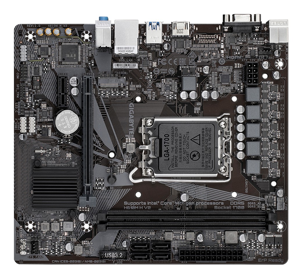 GIGABYTE H610M H V2 Scheda madre - Supporta processori Intel Core 14th CPUs, 4+1+1 Hybrid Digital VRM, up to 5600MHz DDR5, 1xPCIe 3.0 M.2, GbE LAN, USB 3.2 Gen 1. Produttore processore: Intel, Presa per processore: LGA 1700, Processori compatibili: Intel® Celeron®, Intel® Core™ i3, Intel® Core™ i5, Intel® Core™ i7, Intel® Core™ i9,.... Tipi di memoria supportati: DDR5-SDRAM, RAM massima supportata: 96 GB, tipo di slot di memoria: DIMM. Interfacce dell'unità di archiviazione supportate: M.2, SATA III, Tipi di unità di archiviazione supportate: HDD & SSD. Famiglia della scheda grafica: Intel, Adattatore grafico: HD Graphics, Risoluzione massima: 4096 x 2304 Pixel. Connettore USB: USB tipo A