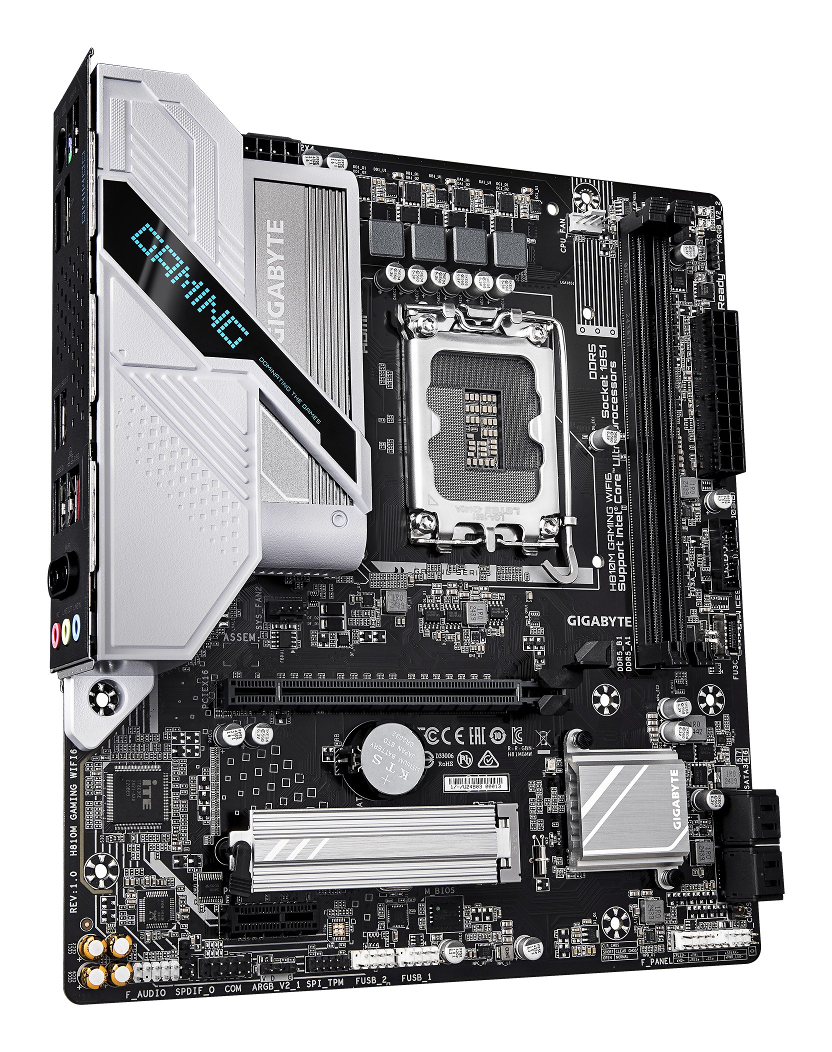 GIGABYTE H810M GAMING WIFI6 Scheda madre - CPU Intel Core Ultra (Serie 2), VRM a 4+1+2 fasi, fino a 6400 MHz DDR5, 1xPCIe 4.0 M.2, LAN 2.5GbE, WIFI 6, USB 3.2 Gen 1. Produttore processore: Intel, Presa per processore: LGA 1851 (Socket V1), Processori compatibili: Intel Core Ultra (Series 2). Tipi di memoria supportati: DDR5-SDRAM, RAM massima supportata: 128 GB, tipo di slot di memoria: DIMM. Interfacce dell'unità di archiviazione supportate: M.2, PCI Express 4.0, SATA III, Tipi di unità di archiviazione supportate: HDD & SSD, Livelli RAID: 0, 1, 5, 10. Risoluzione massima: 4096 x 2160 Pixel. Tipo di interfaccia Ethernet: 2.5 Gigabit Ethernet, Controller LAN: Realtek RTL8125, Wi-Fi standard: Wi-Fi 6 (802.11ax)