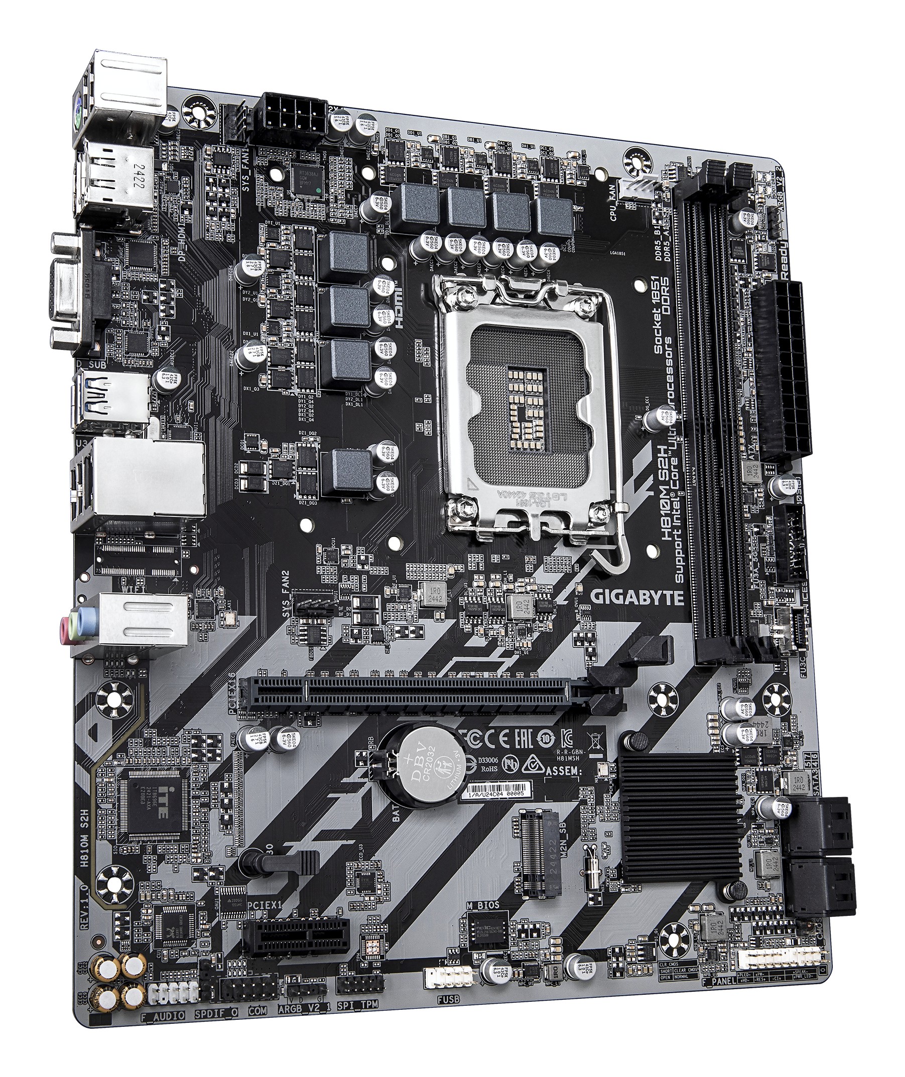 GIGABYTE H810M S2H Scheda madre - CPU Intel Core Ultra (Serie 2), VRM a 4+1+2 fasi, fino a 6400 MHz DDR5, 1xPCIe 4.0 M.2, LAN 1GbE, USB 3.2 Gen 1. Produttore processore: Intel, Presa per processore: LGA 1851 (Socket V1), Processori compatibili: Intel Core Ultra (Series 2). Tipi di memoria supportati: DDR5-SDRAM, RAM massima supportata: 128 GB, tipo di slot di memoria: DIMM. Interfacce dell'unità di archiviazione supportate: M.2, PCI Express 4.0, SATA III, Tipi di unità di archiviazione supportate: HDD & SSD, Livelli RAID: 0, 1, 5, 10. Risoluzione massima: 4096 x 2160 Pixel. Tipo di interfaccia Ethernet: Gigabit Ethernet, Controller LAN: Realtek RTL8111H