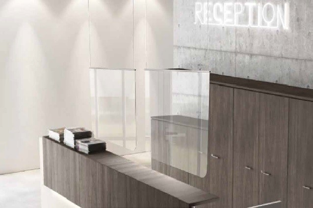 Divisorio in PMMA, montato a sospensione per reception, farmacie e ambulatori, grazie all’utilizzo di supporti per cavo (in montaggio e tenuta)