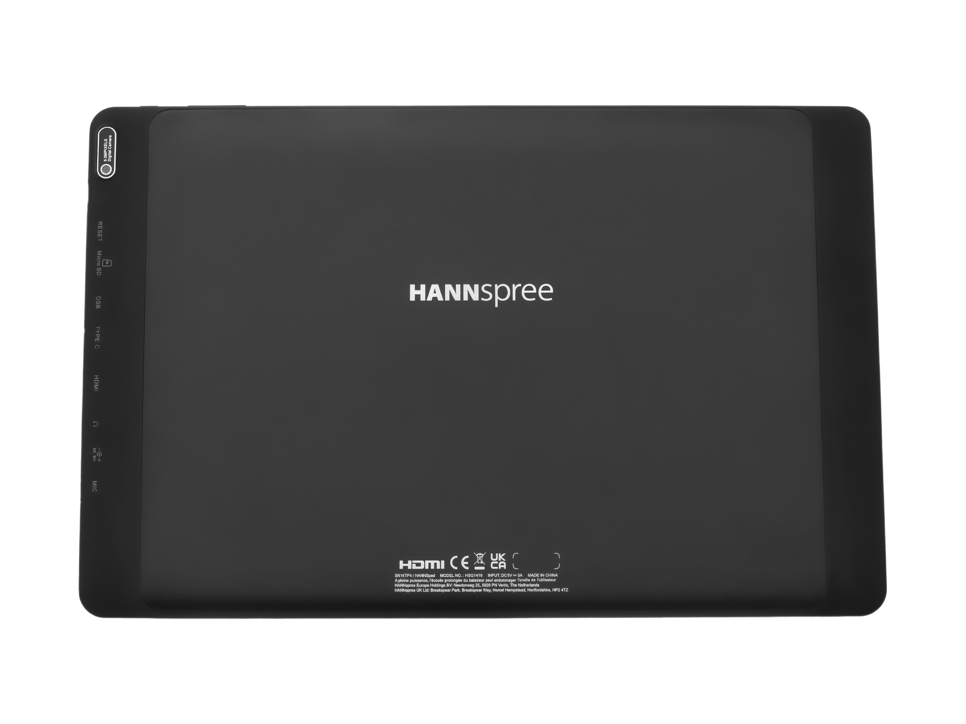 Hannspree HANNSpad Zeus. Dimensioni schermo: 33,8 cm (13.3"), Risoluzione del display: 1920 x 1080 Pixel. Capacità memoria interna: 32 GB. Frequenza del processore: 2 GHz, Famiglia processore: Mediatek, Modello del processore: MT8183. RAM installata: 3 GB. Risoluzione fotocamera posteriore (numerico): 5 MP, Tipo di fotocamera posteriore: Fotocamera singola, Risoluzione fotocamera frontale (numerico): 5 MP. Wi-Fi standard: Wi-Fi 5 (802.11ac). Lettore di schede integrato. Peso: 1,25 kg. Sistema operativo incluso: Android 10. Colore del prodotto: Nero