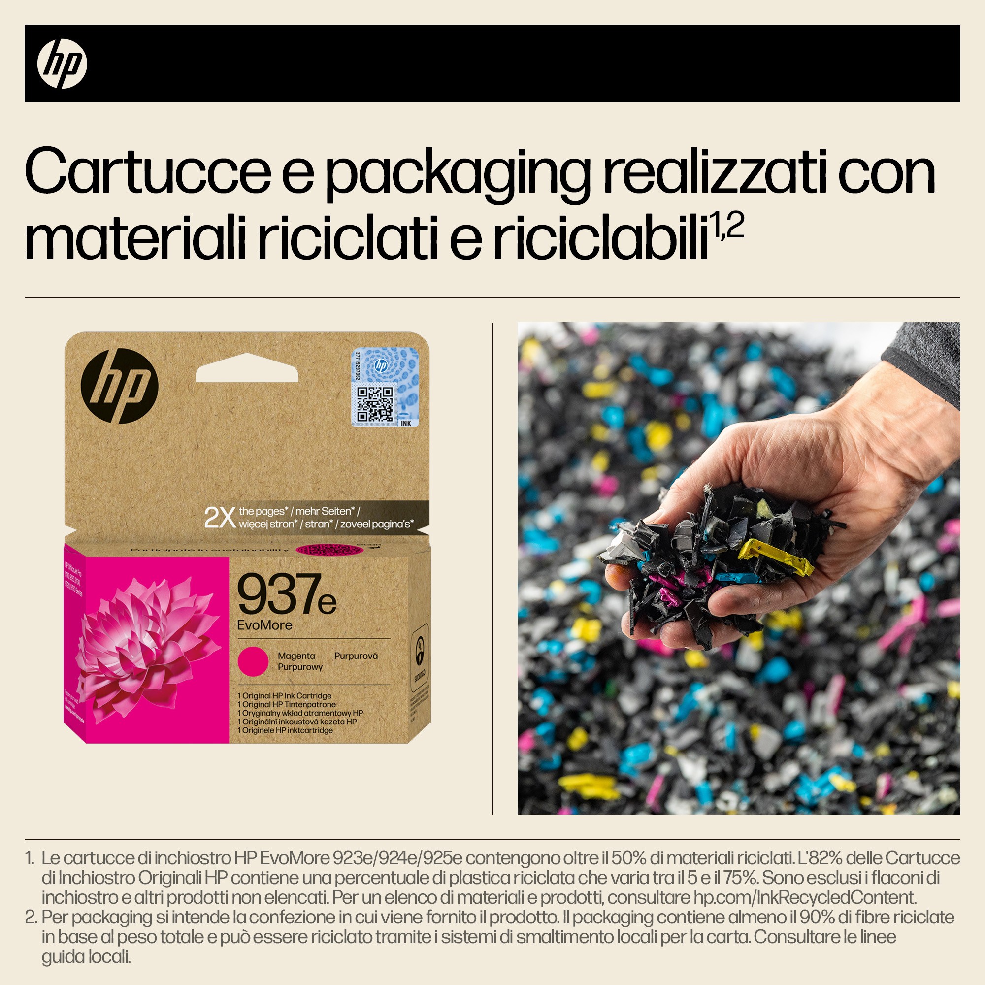 HP Cartuccia di inchiostro magenta originale 937e EvoMore. Tipo di cartuccia: Resa standard, Tipo di fornitura: Confezione singola, Resa in pagine dell'inchiostro a colori: 1650 pagine, Colori di stampa: Magenta, Quantità per pacco: 1 pz