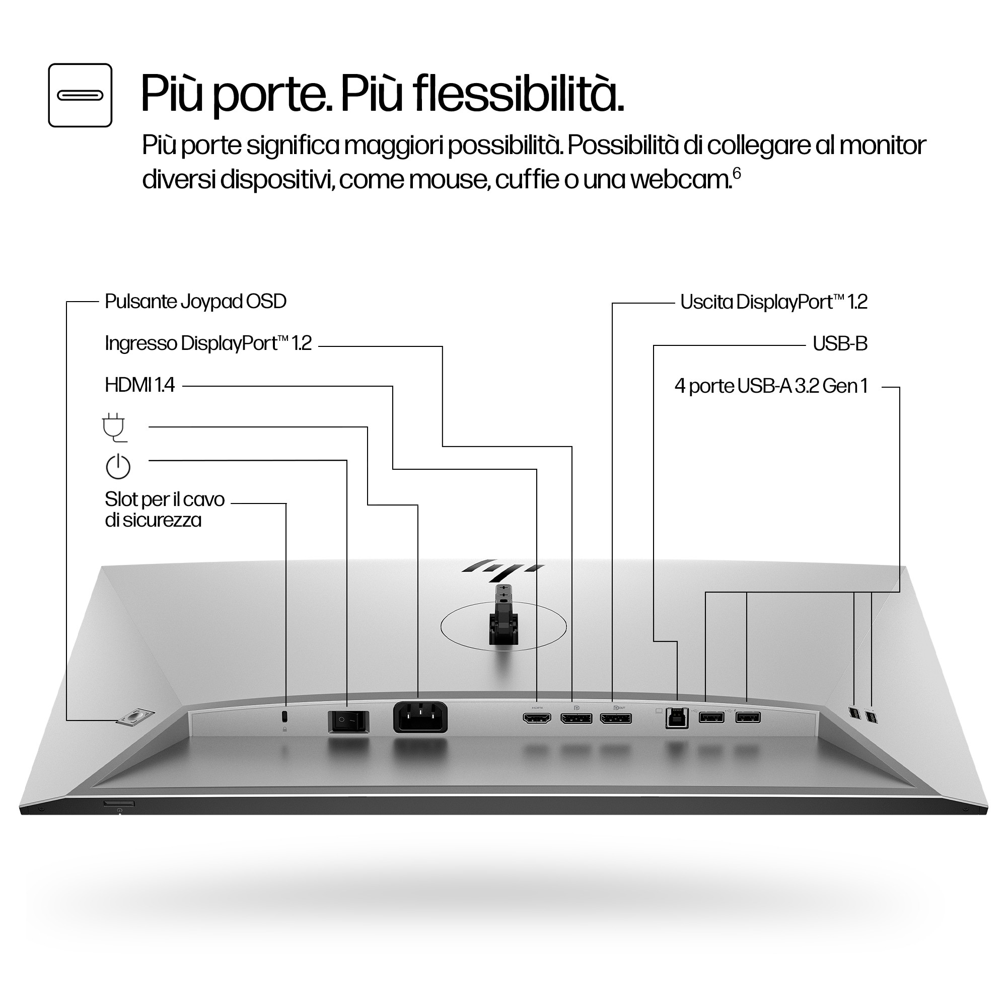 Più porte per maggiori funzionalità. Con una porta HDMI 1.4, 2 DisplayPort™ 1.2 in entrata/uscita e 4 porte USB-A aggiuntive, potete collegare o ricaricare più dispositivi, ad esempio le cuffie e la webcam. [5]
