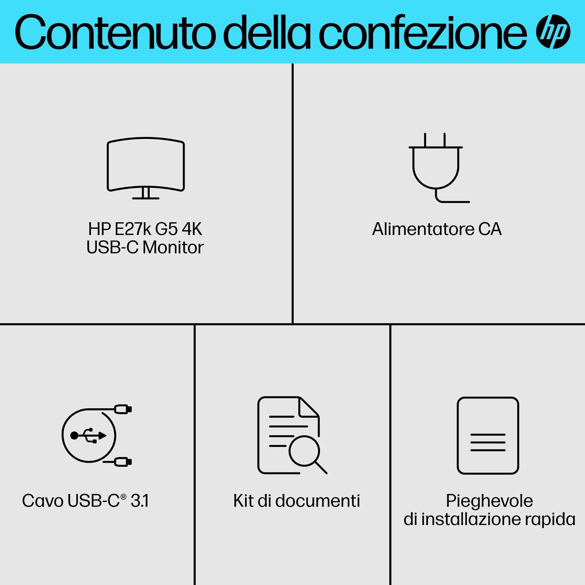 HP E-Series Monitor E27k G5 4K USB-C. Dimensioni diagonale schermo: 68,6 cm (27"), Risoluzione del display: 3840 x 2160 Pixel, Tipologia HD: 4K Ultra HD, Tecnologia display: LCD, Superficie display: Opaco, Tempo di risposta: 5 ms, Rapporto d'aspetto nativo: 16:9, Angolo di visualizzazione (orizzontale): 178°, Angolo di visualizzazione (verticale): 178°. Altoparlanti incorporati. Hub USB integrato, Versione dell'hub USB: 3.2 Gen 1 (3.1 Gen 1). Montaggio standard VESA, Regolazione altezza. Colore del prodotto: Nero, Argento