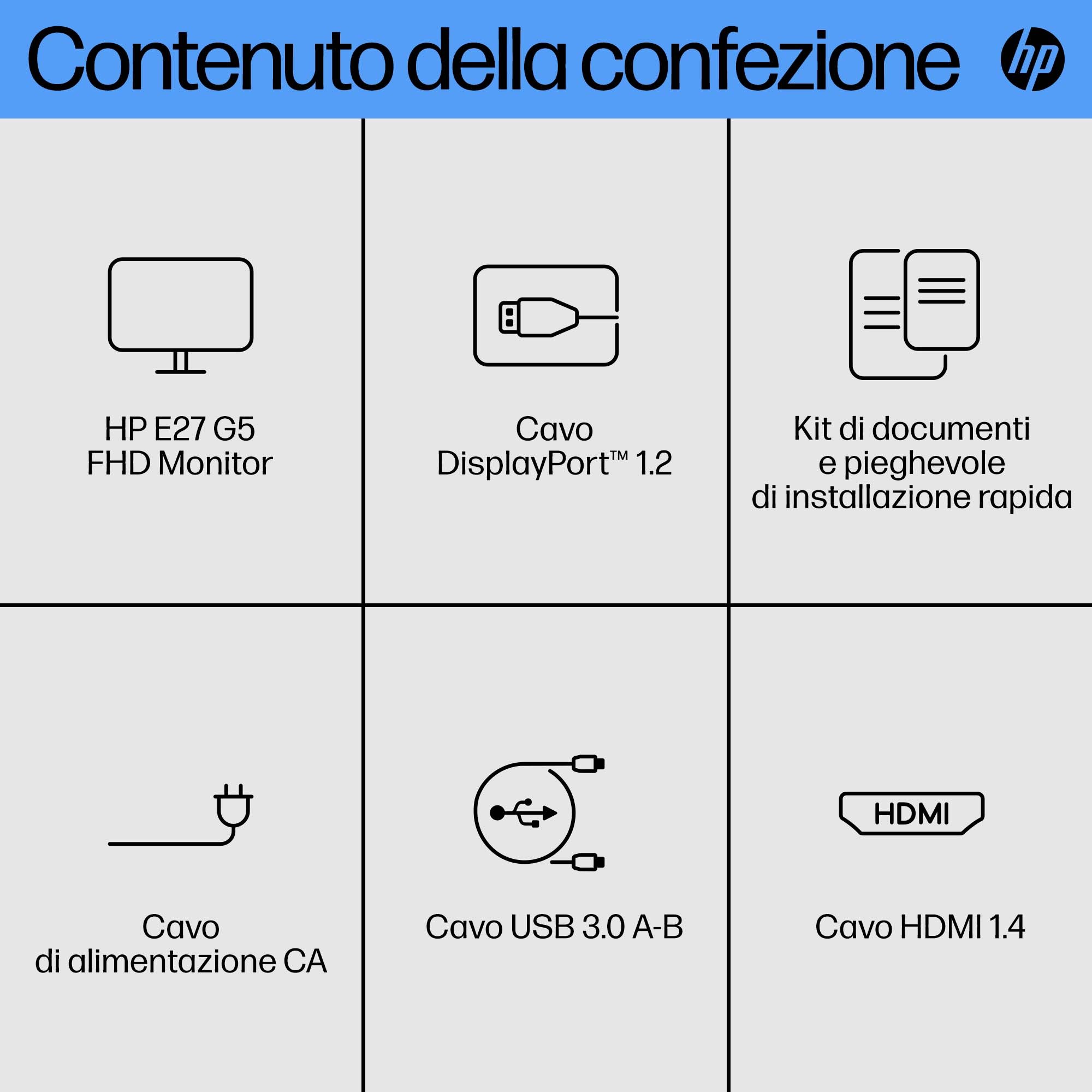 HP Monitor E27 G5 FHD. Dimensioni diagonale schermo: 68,6 cm (27"), Risoluzione del display: 1920 x 1080 Pixel, Tipologia HD: Full HD, Tecnologia display: LCD, Superficie display: Opaco, Tempo di risposta: 5 ms, Rapporto d'aspetto nativo: 16:9, Angolo di visualizzazione (orizzontale): 178°, Angolo di visualizzazione (verticale): 178°. Hub USB integrato, Versione dell'hub USB: 3.2 Gen 1 (3.1 Gen 1). Montaggio standard VESA, Regolazione altezza. Colore del prodotto: Nero