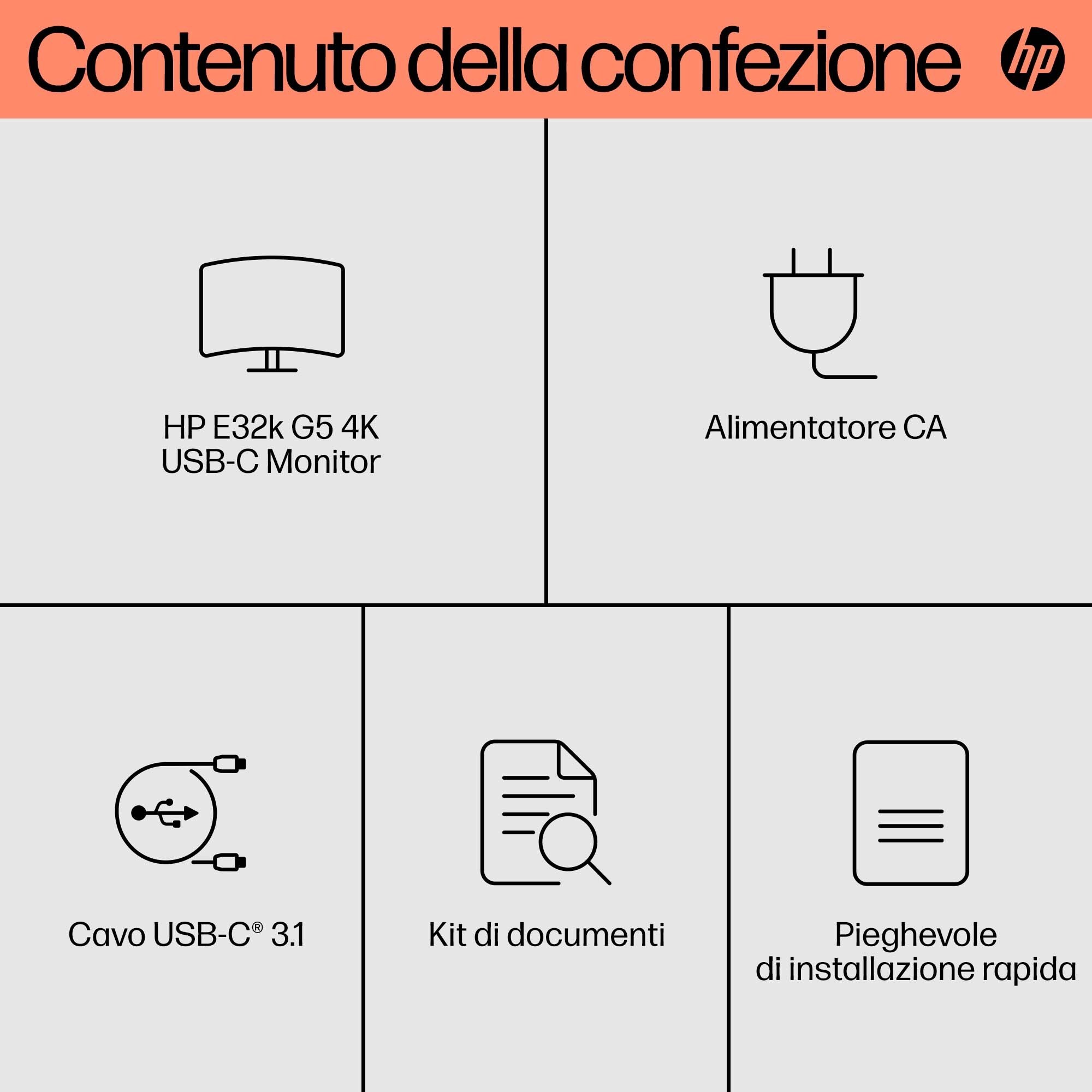 HP Monitor E32k G5 4K USB-C. Dimensioni diagonale schermo: 80 cm (31.5"), Risoluzione del display: 3840 x 2160 Pixel, Tipologia HD: 4K Ultra HD, Tecnologia display: LCD, Superficie display: Opaco, Tempo di risposta: 5 ms, Rapporto d'aspetto nativo: 16:9, Angolo di visualizzazione (orizzontale): 178°, Angolo di visualizzazione (verticale): 178°. Altoparlanti incorporati. Hub USB integrato, Versione dell'hub USB: 3.2 Gen 1 (3.1 Gen 1). Montaggio standard VESA, Regolazione altezza. Colore del prodotto: Nero
