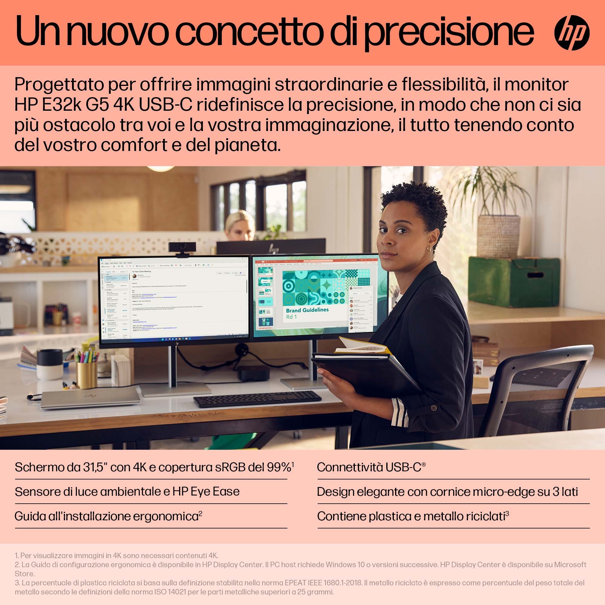 Progettato per offrire una qualità grafica incredibile e la massima flessibilità, il monitor HP E32k G5 4K USB-C ridefinisce il concetto di precisione. Con uno stile elegante e un design che pensa al tuo comfort e alla tua produttività, questo monitor 4K è progettato secondo principi di sostenibilità.