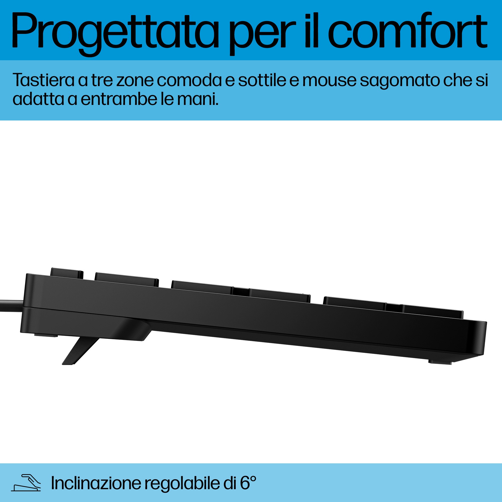 Una tastiera per il massimo comfort, con un design compatto e tasti silenziosi dal profilo basso. Il familiare layout a tre zone include tastierino numerico e tasti freccia, con un'inclinazione regolabile di 6° per adattarsi alla posizione del polso dell'utente. Il mouse sagomato è progettato per una impugnatura perfetta sia con la mano destra sia con la sinistra.