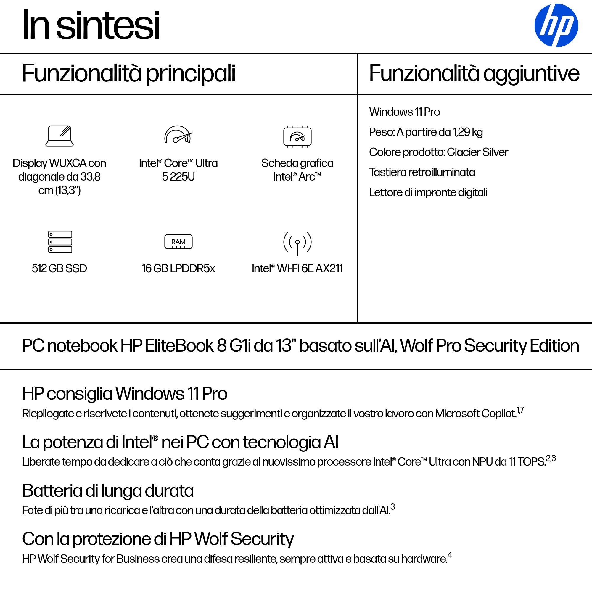 HP EliteBook 8 G1i. Tipo di prodotto: Computer portatile, Fattore di forma: Clamshell. Famiglia processore: Intel Core Ultra 5, Modello del processore: 225U. Dimensioni diagonale schermo: 33,8 cm (13.3"), Tipologia HD: WUXGA, Risoluzione del display: 1920 x 1200 Pixel. Memoria Interna: 16 GB, Tipo di RAM: LPDDR5x-SDRAM. Capacità totale di archiviazione: 512 GB, Supporto di memoria: SSD. Modello scheda grafica integrata: Intel Arc Graphics. Sistema operativo incluso: Windows 11 Pro. Colore del prodotto: Argento. Peso: 1,29 kg