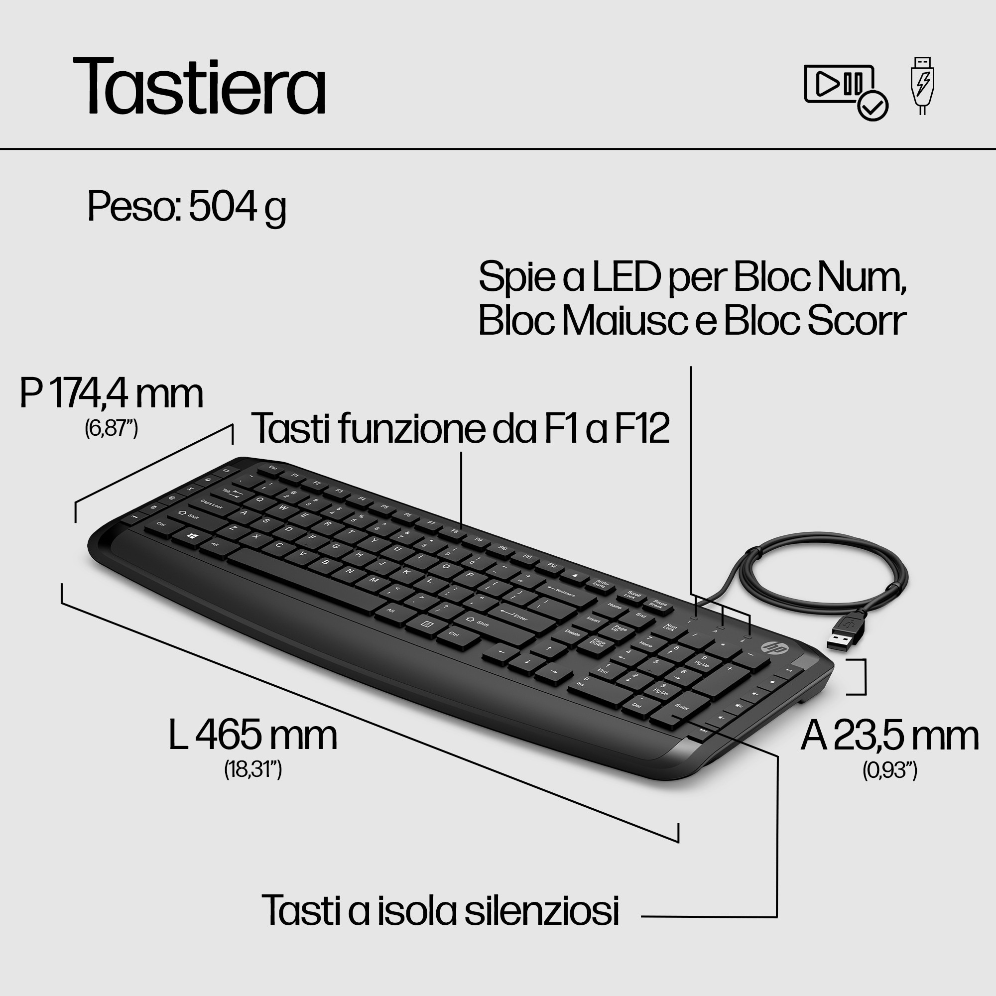 | Dimensioni tastiera (WxDxH) | 465 x 174,4 x 23,5 mm |