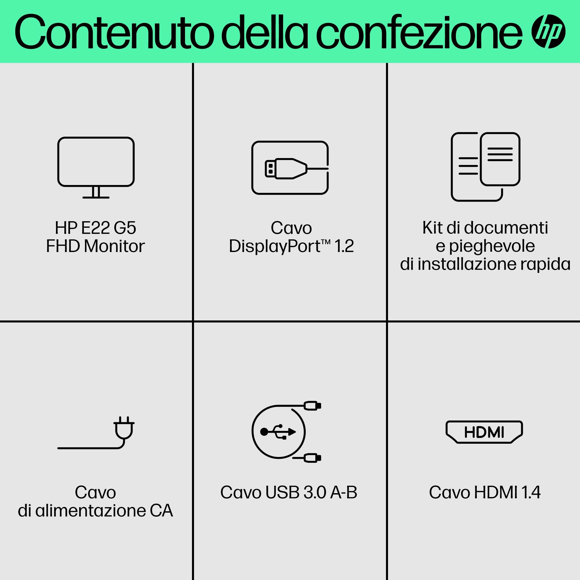HP E-Series Monitor E22 G5 FHD. Dimensioni diagonale schermo: 54,6 cm (21.5"), Risoluzione del display: 1920 x 1080 Pixel, Tipologia HD: Full HD, Tecnologia display: LCD, Superficie display: Opaco, Tempo di risposta: 5 ms, Rapporto d'aspetto nativo: 16:9, Angolo di visualizzazione (orizzontale): 178°, Angolo di visualizzazione (verticale): 178°. Hub USB integrato, Versione dell'hub USB: 3.2 Gen 1 (3.1 Gen 1). Montaggio standard VESA, Regolazione altezza. Colore del prodotto: Nero, Argento