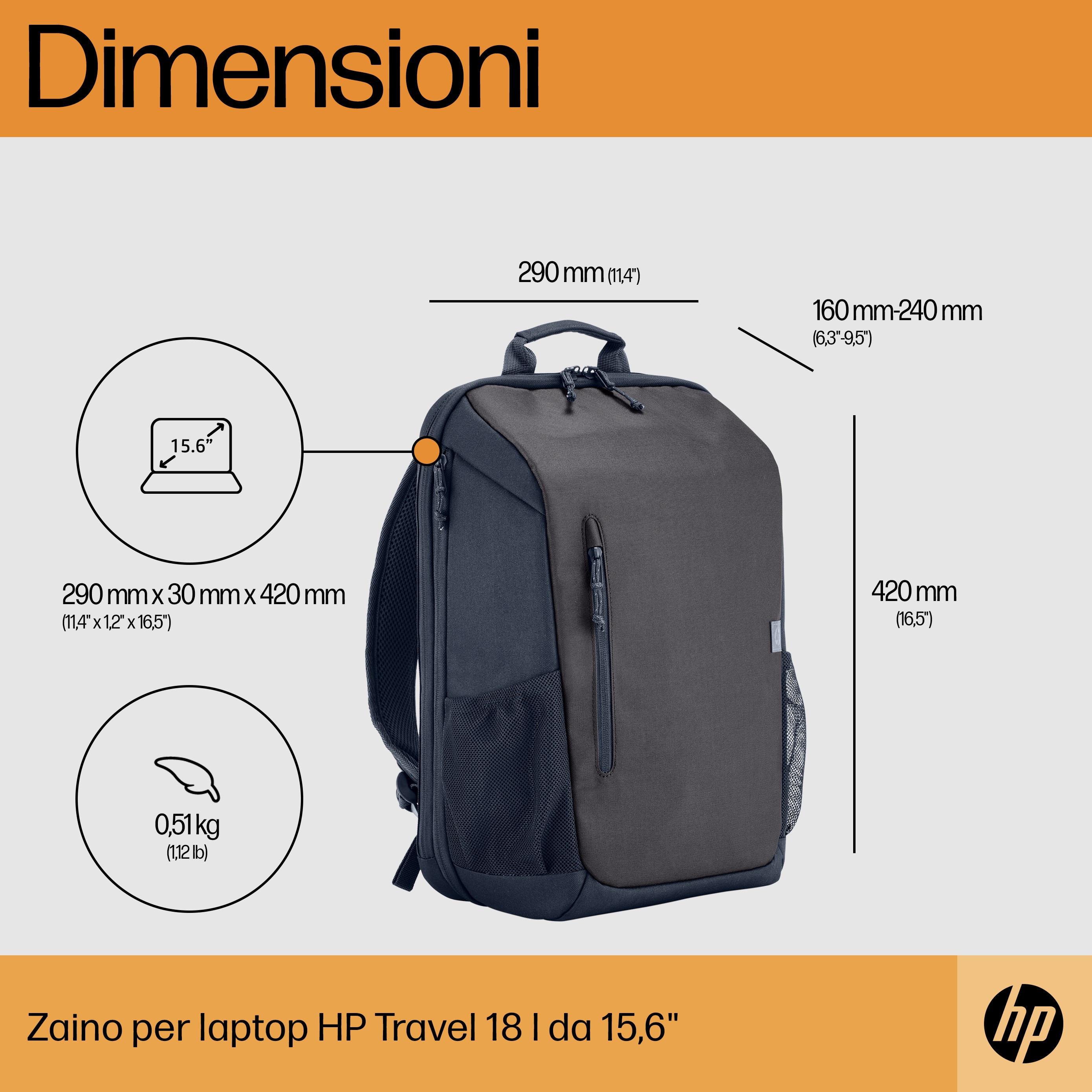 HP Zaino per laptop da 15,6" Travel 18 litri Iron Grey. Tipologia custodia: Zaino, Capienza massima dimensioni dello schermo: 39,6 cm (15.6"). Peso: 510 g
