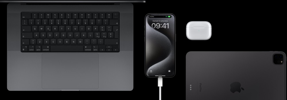 Con il nuovo connettore USB‑C puoi caricare il Mac o l’iPad usando lo stesso cavo che usi per iPhone 15 Pro. Bye bye doppioni.