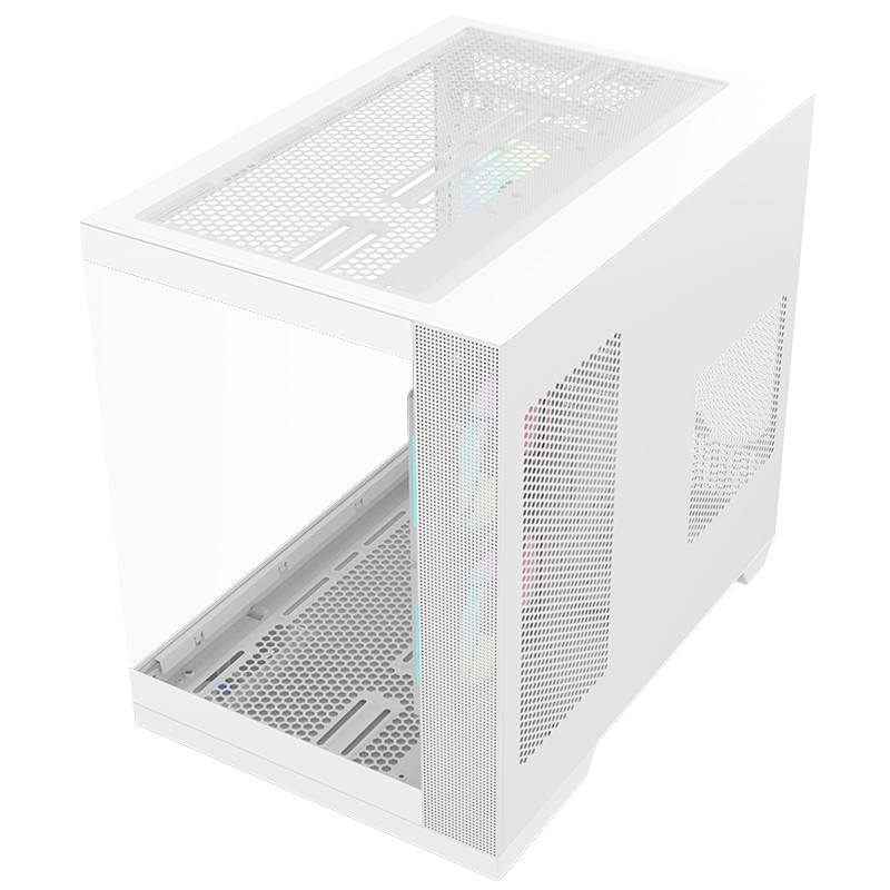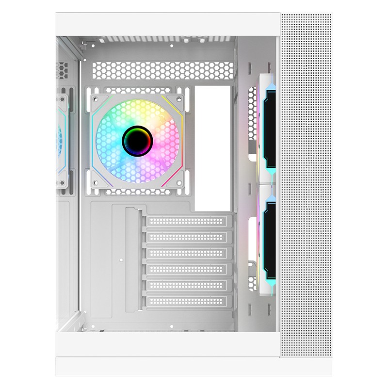 Itek DARK CAVE DS è una soluzione più compatta rispetto alle altre versioni di DARK CAVE. E stato progettato per soddisfare le richieste degli utenti che hanno bisogno di estetica, performance, versatilità, facilità di assemblaggio ma in dimensioni più contenute! La paratia frontale e laterale sono in vetro temperato per mostrare le componenti all'interno. Quella laterale ha una comoda apertura ad incastro e senza viti per un immediato accesso all'hardware. Internamente lo spazio è tantissimo, è infatti possibile installare schede video di ultima generazione di lunghezza fino a 400mm, dissipatori alti 175mm, liquid cooling fino a 360mm, diverse ventole aggiuntive e il cable management è addirittura di 90mm. In dotazione sono presenti 3 ventole ARGB di ultimissima generazione "Infinity", per una resa estetica al top e un air flow ottimale. Tutte gestite dal comodo HUB e, in alternativa, dal tasto reset o direttamente dalla motherboard. Il posizionamento dei collegamenti audio, 2 porte USB 3.0 e una Type-C è situato nella parte inferiore del case!